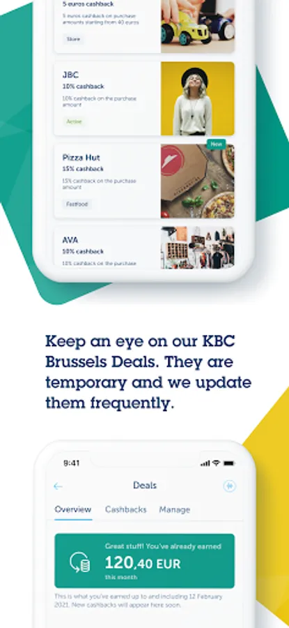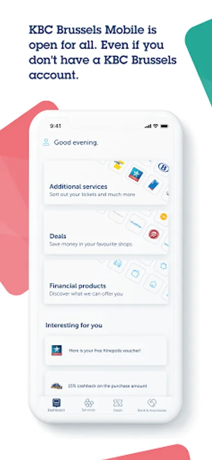 If you already have a current account with us, you can use our KBC Brussels Mobile app to the full. That includes access to a host of handy additional services. For instance, you can rent a shared bike, buy cinema and theme park tickets, pay for parking, order service vouchers, and much more besides. KBC Deals is another great feature you won’t want to miss if you'd like to earn cashback rewards at lots of local and national partners. And earn Kate Coins too, our digital coin that you can use to pick up tidy benefits.
