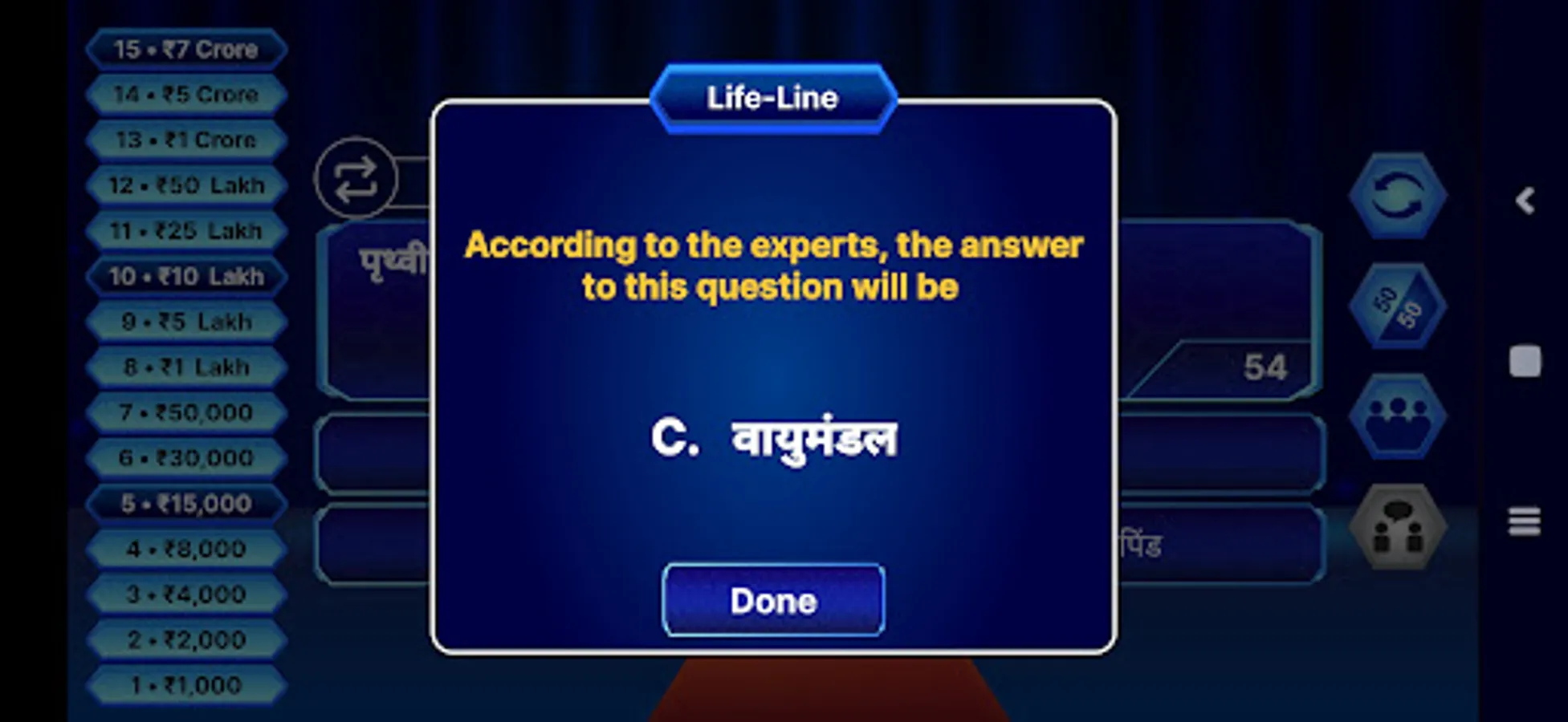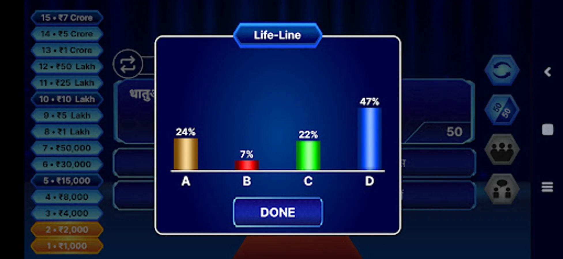 KBC Crorepati Quiz Game in Hindi and English is a multiple choice-based quiz game with amazing sound effects that will give you a completely new experience. This game is completely new designed and it contains General Knowledge Quiz of various subjects like History, Geography, Science and Astrology which helps you to learn.