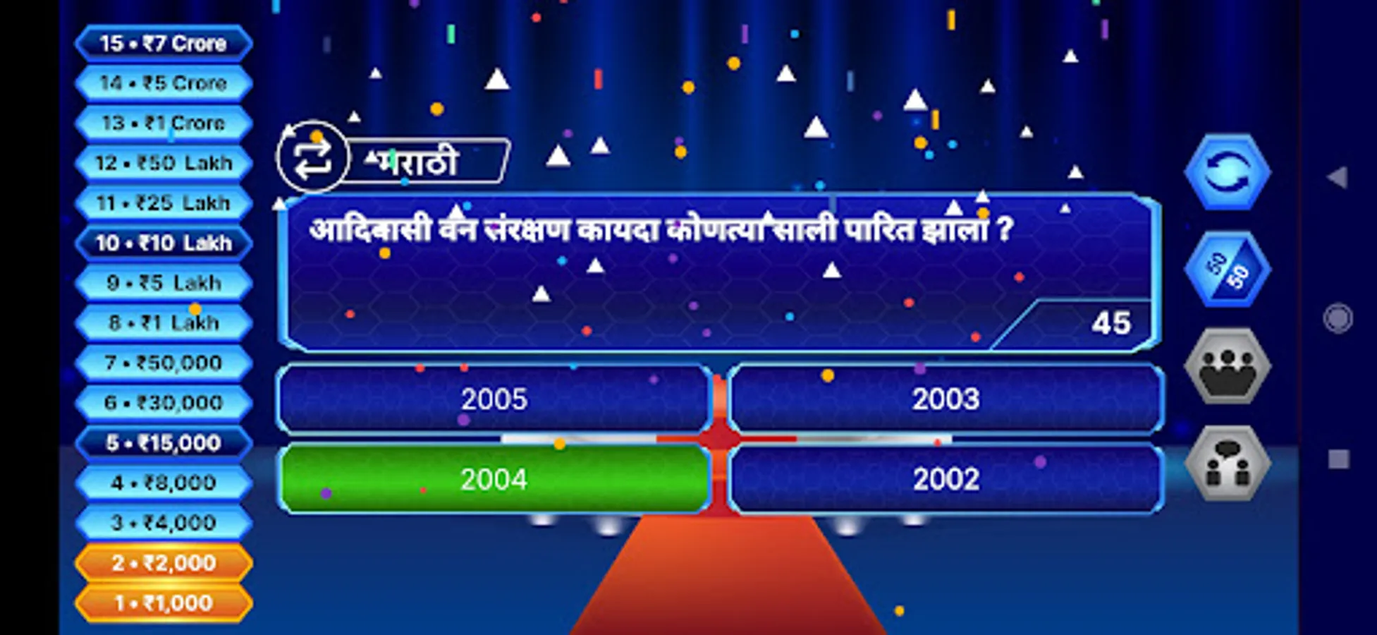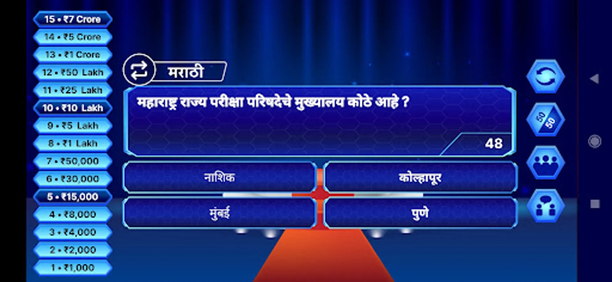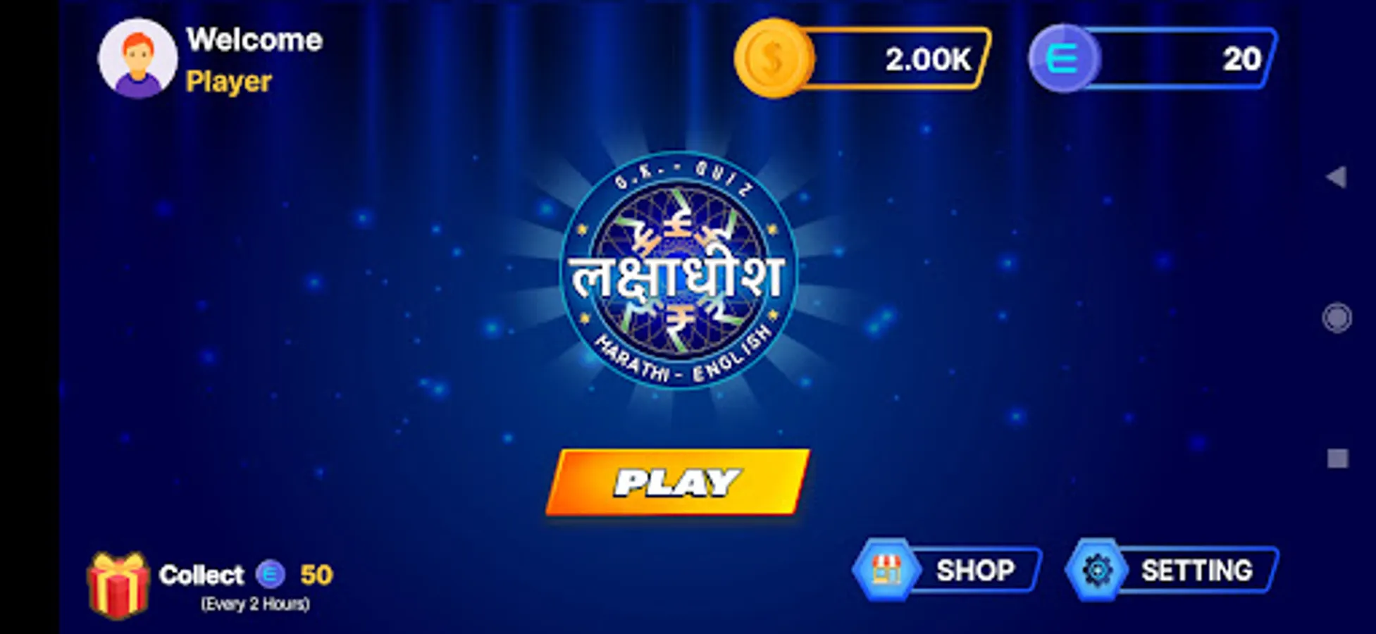 A multiple-choice quiz game with outstanding sound effects, the KBC Crorepati Quiz Game in Marathi and English will provide you with a brand-new experience. This game's entirely new design includes general knowledge quizzes on a variety of topics, covering science, history, geography, and astrology, which improve in education.