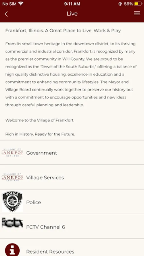 The Village of Frankfort is located less than an hour from downtown Chicago in Will County, Illinois. The Village of Frankfort Smartphone Application is a free application that serves as a resource for both residents and visitors. Including department and staff directories, an event calendar, video updates, police alerts and a service request form, this interactive tool is a great way to keep up-to-date with happenings in the community and stay involved. Download the Village of Frankfort App today!