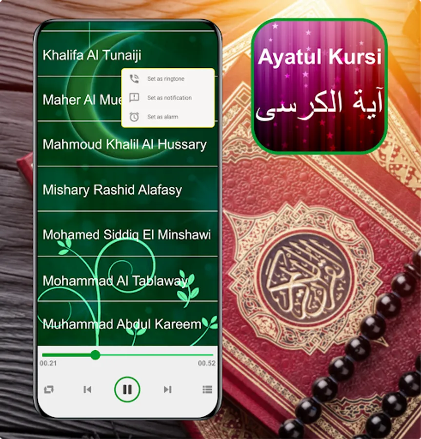 Ayatul Kursi is a Smartphone application that brings Muslims all over the world an opportunity to listen to beautiful recitation of highly blessed Verse of Kuri present in second Chapter of the Holy Quran. Besides Translation and Transliteration, it also provides user with Tajweed and Testing one`s own Tajweed for increased understanding of appropriate pronunciations during recital.