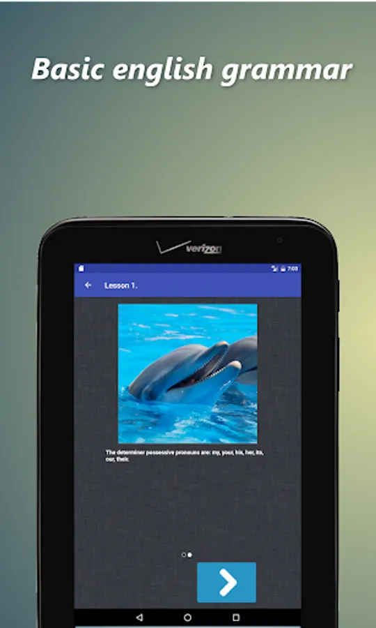 Main goal of this application is to learn basic english grammar rules. English exercises This app is perfect for elementary levels. It contains eight chapters. Each chapter contains short explanations of english grammar, quizzes for each lesson.