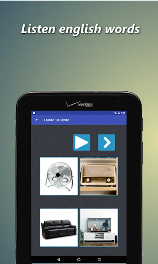 English language teaching app. You can study in two ways. First type is to say the word from picture. Second training type is to listen english word and find it on the pictures. Two types of learning will help you to easy recall this word later.