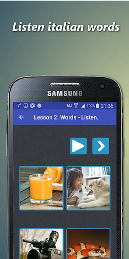 Learn italian basic. You can study in two ways. First type is to say the word from picture. Second training type is to listen italian word and find it on the pictures. Two types of learning will help you to easy recall this word later. Learn to speak italian offline.