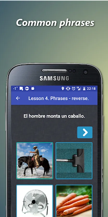 In this application you will be able to learn 300 common Spanish words and phrases. During the training you need to choose the correct translation from the options.