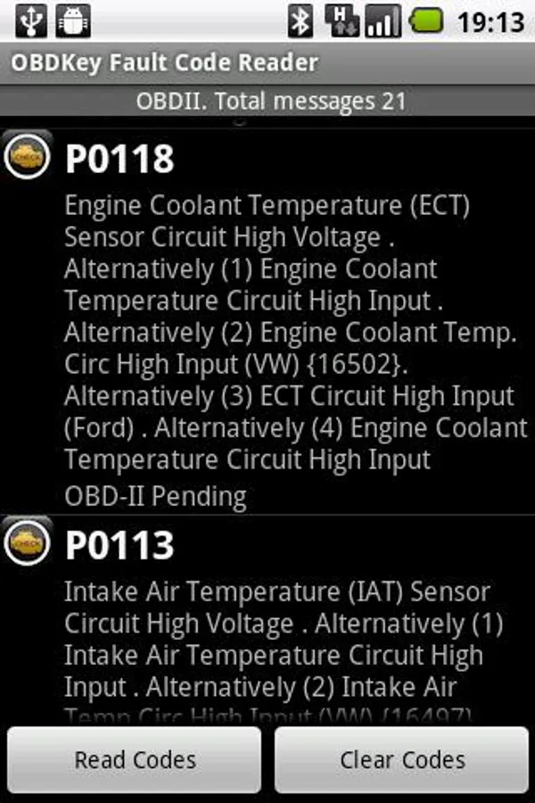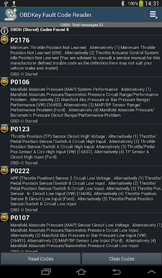 OBDKey Fault Code Reader is a fault code reading, lookup and clearing application for Android that allows you to access your car's control units (ECUs) to get any fault codes.