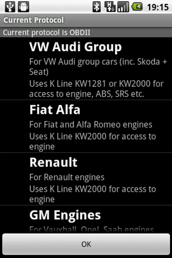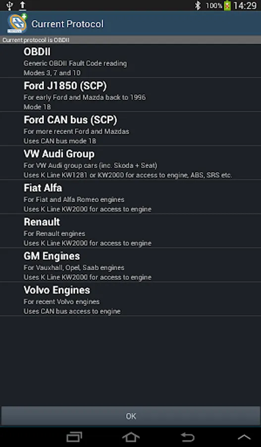 Features include fully automatic Bluetooth connection once pairing has been established, user fault code look up, easy navigation using menus, landscape and portrait modes both supported, HDPI, MDPI and LDPI screen options, works with larger “tablet” devices. English only at present.