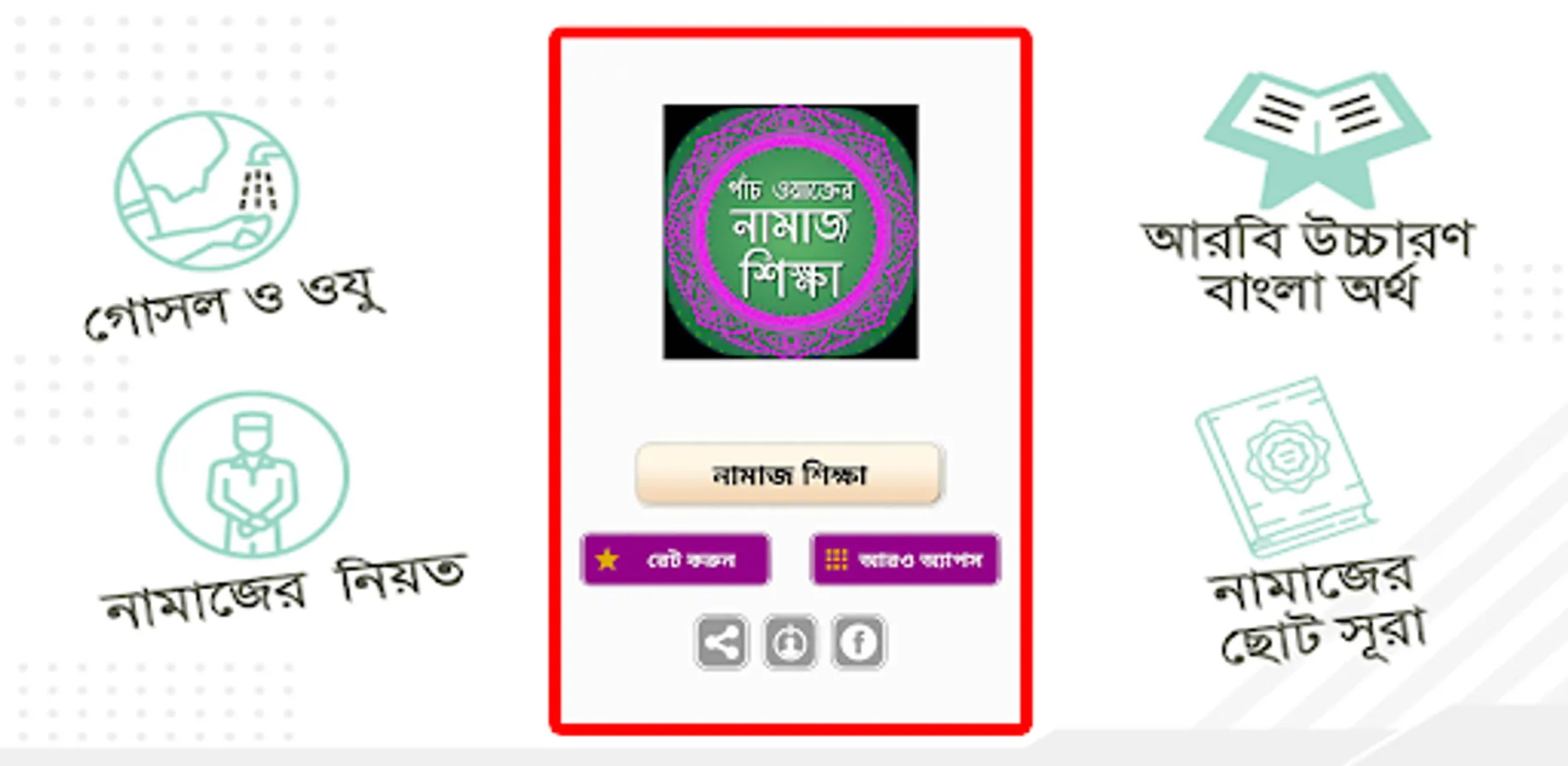 পাঁচ ওয়াক্তের নামাজ শিক্ষা, সহীহ্ নামাজ শিক্ষা ও আল কুরআন, সহীহ্ নামাজ শিক্ষা প্রয়োজনীয় ইসলামিক তথ্য সম্বলিত ও পূণাঙ্গ পাঁচ ওয়াক্ত নামাজ ও কুরআন শিক্ষার অ্যাপ। এর মাধ্যমে পাঁচ কালেমা, পবিত্রতা, সকল দোয়া কালাম, চিত্রসহকারে পূণাঙ্গ নামাজ শিক্ষা, ফজিলতপূর্ণ বিভিন্ন সূরা ও আয়াতের আমল, রোযা, ঈদ, যাকাত, হজ্জ ও উমরাহ, কোরবানি ও আকীকাহ, সহীহ হাদিস, কুরআন শিক্ষা, ইসলামিক নাম, নামাজের সময়সূচীসহ আরো অন্যান্য বিষয়ে শিখতে ও জানতে পারবেন। নামাজের নিয়ম ও গুরুত্বপূর্ণ নামাজের দোয়া ও সূরা সমূহ নিয়ে আমাদের ডেভলপার টীম নামাজ শিক্ষা—সূরা ও দোয়া শির্শক এই শিক্ষামূলক অ্যাপটি তৈরি করেছেন। বাজারে যে পাঁচ ওয়াক্তের নামাজ শিক্ষা বই গুলো পাওয়া যায় যেমন, নামাজ শিক্ষা বই হানাফি, নুরানি নামাজ শিক্ষা বই ইত্যাদি তার সহিহ ও শুদ্ধ আধুনিক সংস্করণ হিসেবে এই অ্যাপটি অনন্য ভূমিকা পালন করবে। অভিজ্ঞ আলেমগণের পরামর্শ অনুযায়ী এই বাংলা নামাজ শিক্ষা অ্যাপটি ডেভলপ করা হয়েছে যাতে নামাজ শিক্ষা ও প্রয়োজনীয় সূরা সমুহ অত্যান্ত দক্ষতার সাথে লিপিবদ্ধ করা আছে।