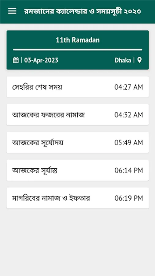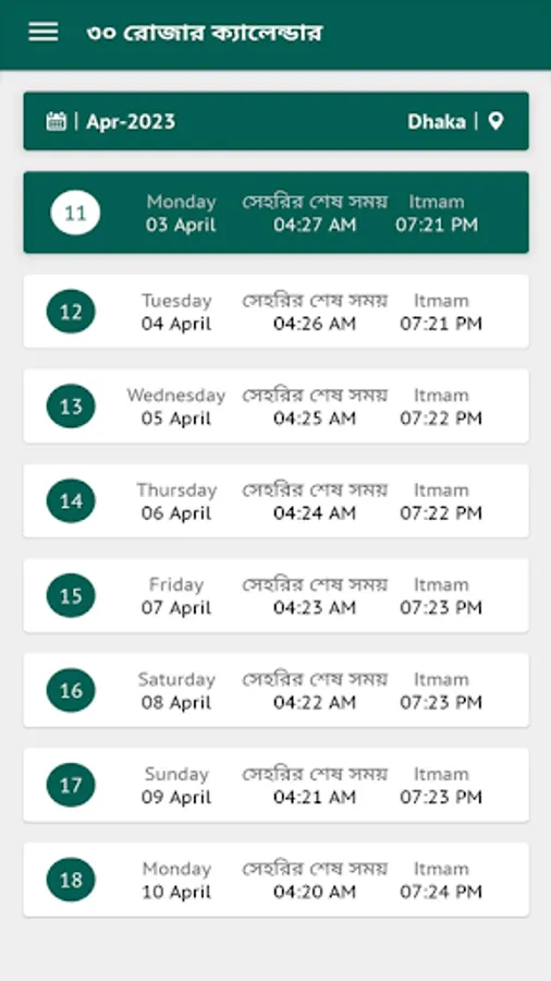 It's a full featured Ramadan Calendar for the year 2023. This app will provide 30 days of Ramadan Sheri and Iftar time. Time is personalized for the different 64 districts of Bangladesh. So no need to calculate time separately with Dhaka time. As well as it will show the remaining times with a countdown timer.