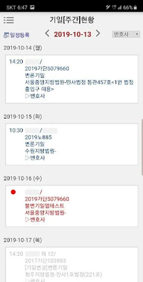 v 나의사건 진행내역을 개별 및 전체 자동업데이트 기능으로 자동 생성되는 기일현황