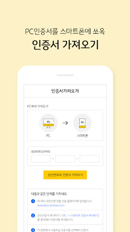 - For iOS users, you can not directly use the certificate in your mobile phone. After transferring the certificate to the PC through your financial institution, connect the KB Smart Loan PC Homepage (www.kbsmartloan.com) Import 'is available.