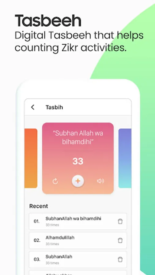 • Digital Tasbeeh counter for dhikr.