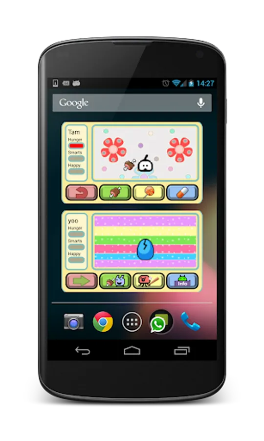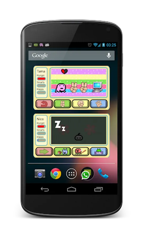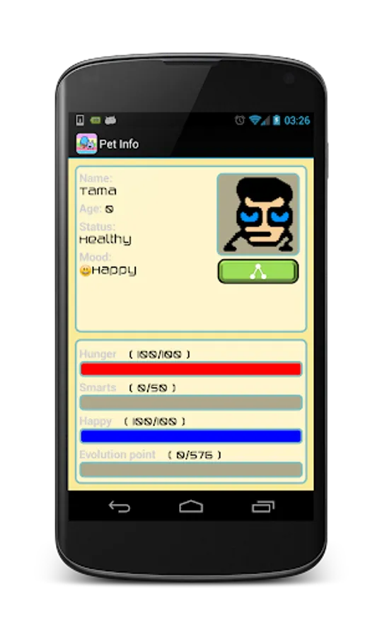 In your home screen, you can feed the pet and hero, play with it, clean it and what the virtual pets of 90's can do.