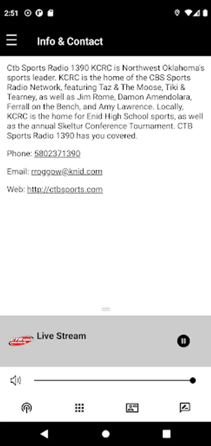 Ctb Sports Radio 1390 KCRC is Northwest Oklahoma's sports leader. KCRC is the home of the CBS Sports Radio Network, featuring Taz & The Moose, Tiki & Tearney, as well as Jim Rome, Damon Amendolara, Ferrall on the Bench, and Amy Lawrence. Locally, KCRC is the home for Enid High School sports, as well as the annual Skeltur Conference Tournament. CTB Sports Radio 1390 has you covered.