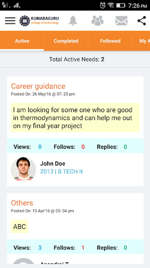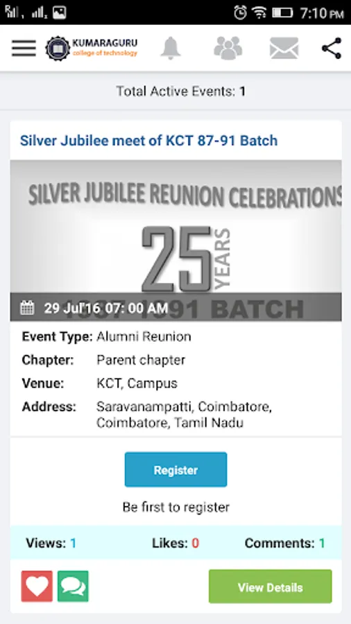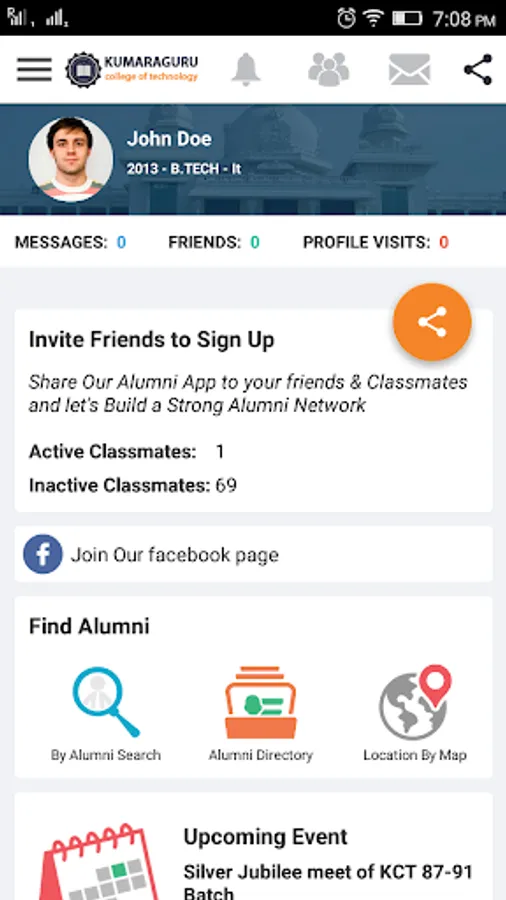 KCT Alumni Association is private social community app created exclusively for the alumni members of Kumaraguru College of Technology. With this App the Alumni can find their fellow alumni, share their moments, participate in the college events and keep posted with the live activities of the Association.