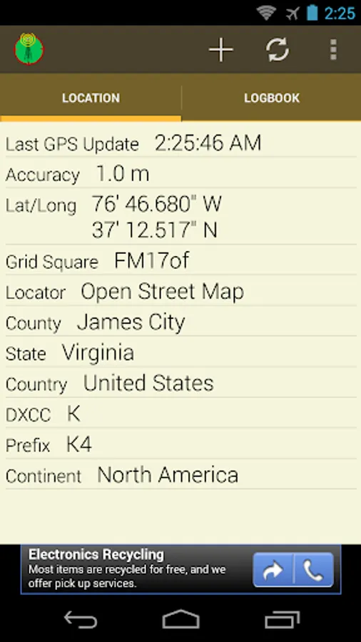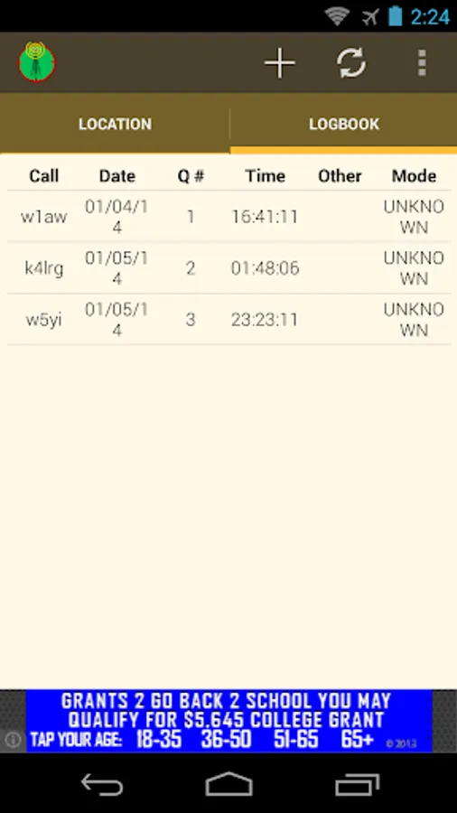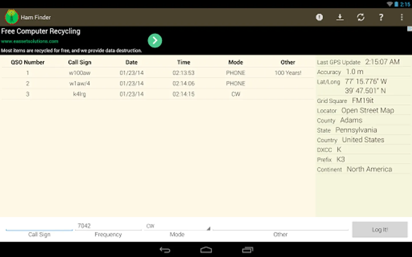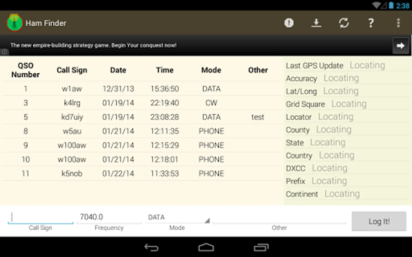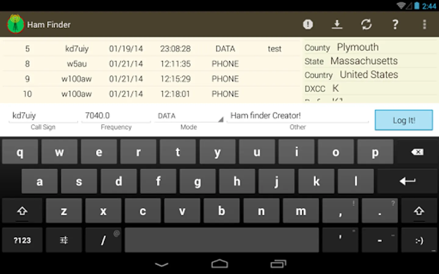 Works with either phones, or tablets. Tablet version makes it easier to manipulate data, and do logging, even having the ability to see current data while logging on screen (See screen shots). ADIF files can be exported, including all information collected (Upgrade required). The feature list is improving constantly, now the ability to edit and delete log entries is included, along with a database of all LOTW listed call signs. Submit your logs to Logbook of the World and eQSL. LOTW includes putting the logged information from Ham Finder in to your contact, so you can travel from gridsquare to gridsquare and not have to do anything special to log your contacts! See a map of where you've made QSOs that are logged. Check the DXCC of the callsign you are considering logging. More coming soon!