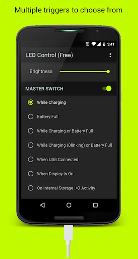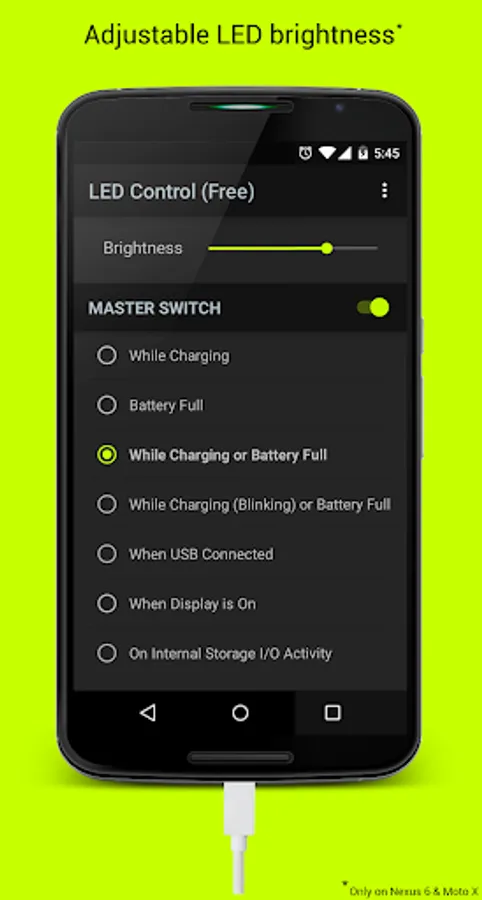 · Brightness Slider: Control your 'charging' LED's brightness while charging, if your device supports it. Currently works only on Moto X and Nexus 6.