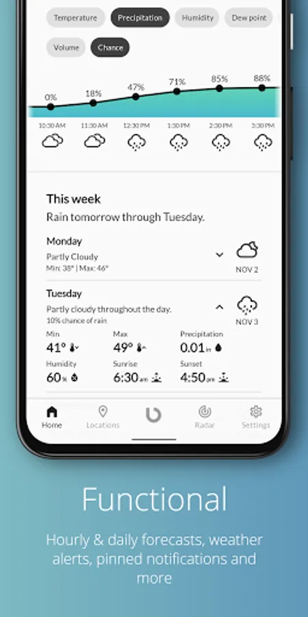 Get the latest weather on your status bar and notification tray with Clyma's pinned notification feature and customizable auto-refresh interval