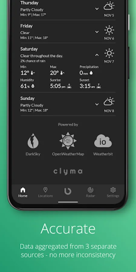Clyma uses 3 separate weather providers to ensure you get the most accurate weather, every time. 🌡️ Get hour-by-hour weather and daily weather at a single glance, including chance of rain, humidity, Air Quality Index (AQI), wind speed/wind direction, dew point and UV Index, with an easy-to-use, clean and simple design, delightful animations and bold colours. ❄️ Get the latest weather pinned to your notification tray and status bar with Pinned Notifications! 📌 Choose from multiple themes, including support for dark theme and a full black theme for OLED screens. 🌙 View accurate and latest weather info on the go with Clyma's multiple convenient 5 customizable homescreen widgets to match your specific needs! 🌇