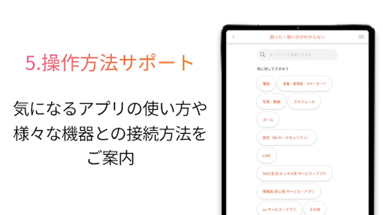・Easy-to-understand guidance on how to use smartphones and tablets, as well as apps that interest you, and how to connect and operate devices that connect to smartphones and tablets, such as TVs and audio equipment.
