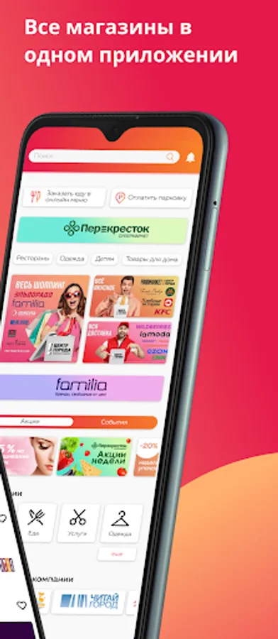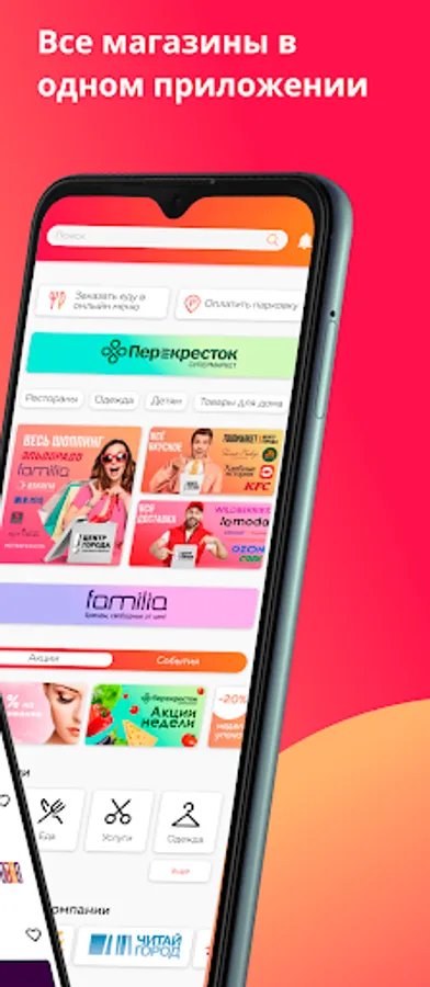 On 50 hectares of atmospheric space there are: MFC for 50 windows, federal and regional brands: supermarkets "Perekrestok", FixPrice, electronics hypermarkets "Eldorado", DNS, book supermarket "Chitay Gorod", clothing store "Familia", "Children's World", "Stilpark", the largest Foodmarket in the Southern Federal District, more than 60 cafes and restaurants: "Naked Chef", "Tasty - and that's it", KFC, Luka Pizza, "Khlebnye istorii", shops of organic products "Carrot", "BIOFAM", and more than 400 shops and services for beauty, health, recreation and entertainment.