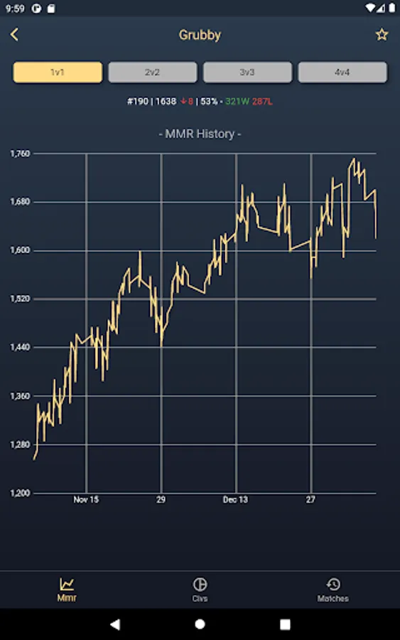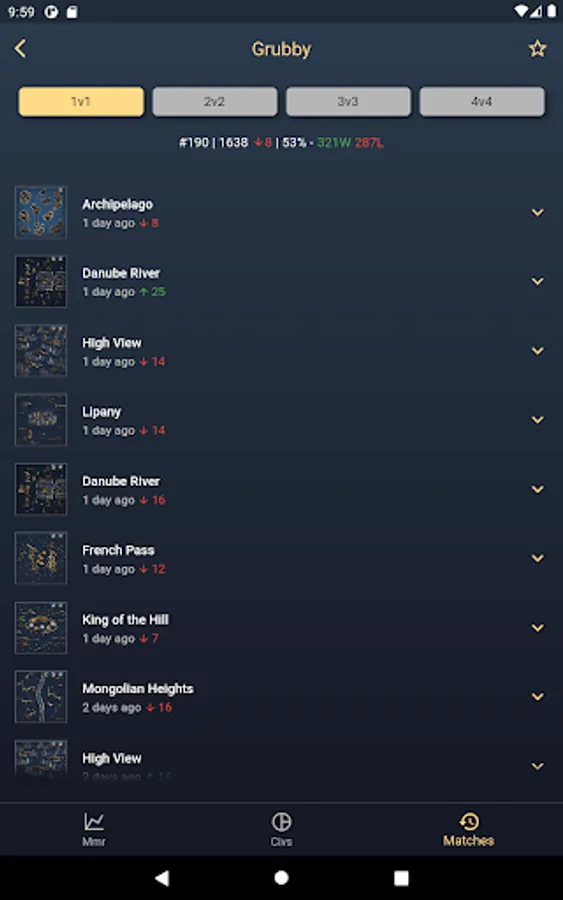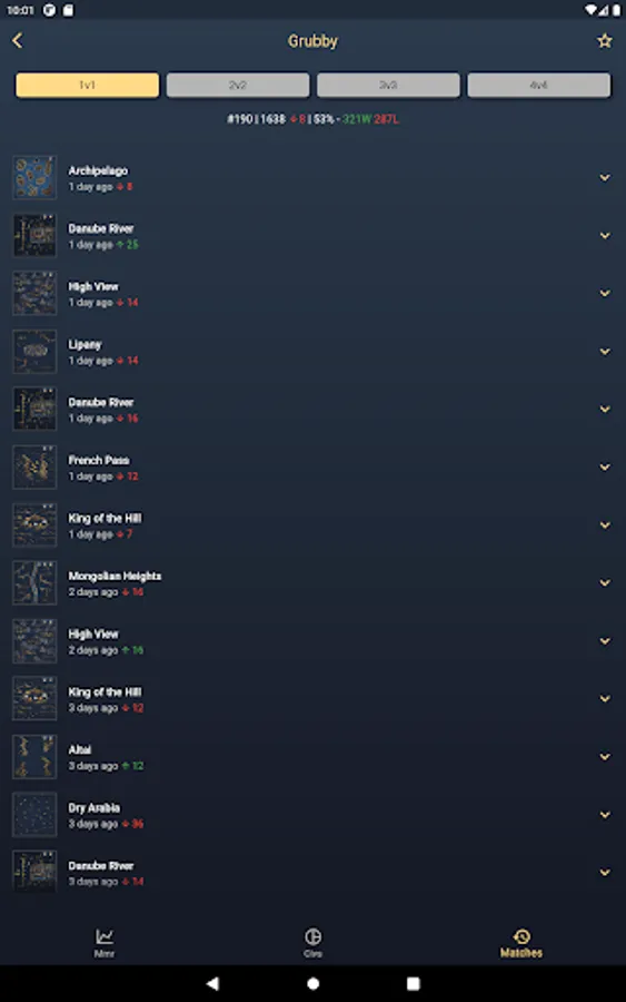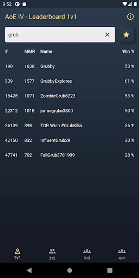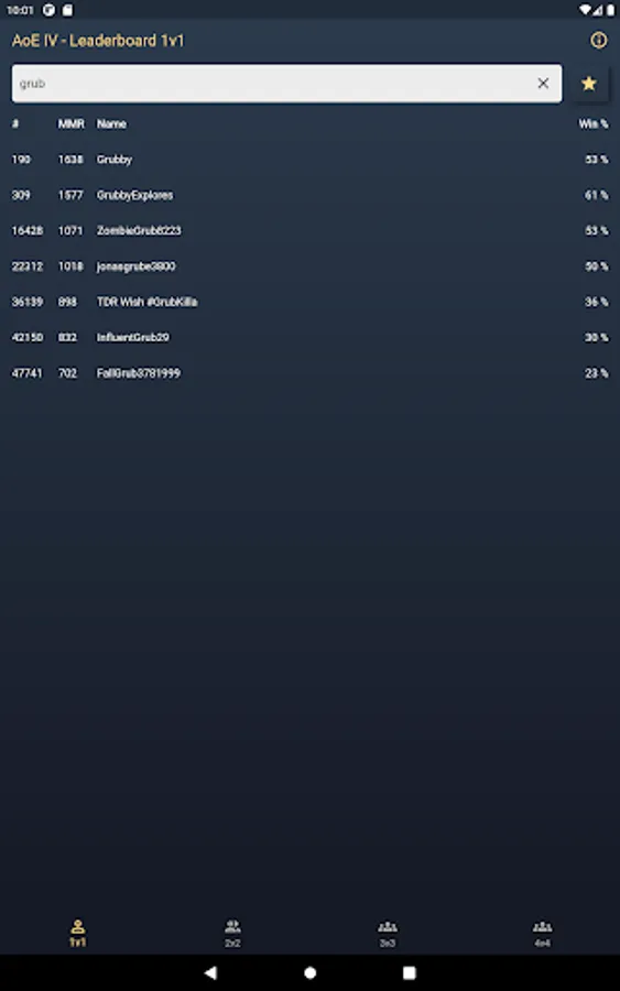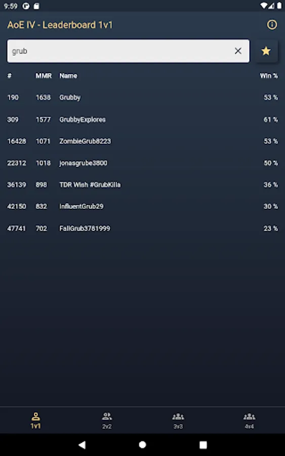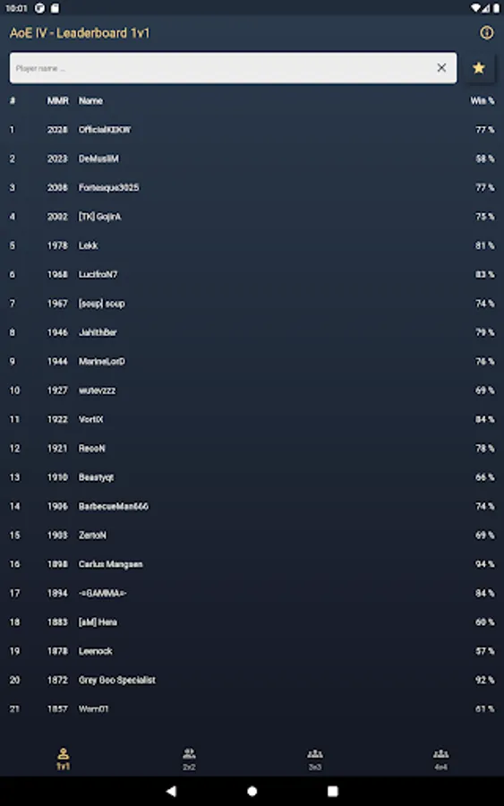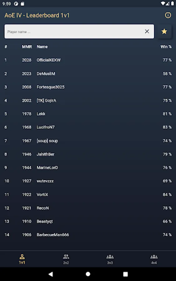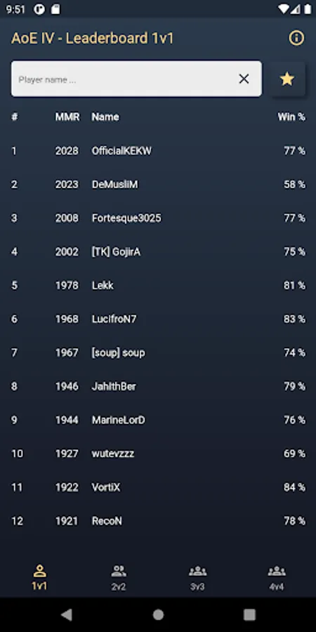 This application shows the leaderboards of the current game modes 1v1, 2v2, 3v3 and 4v4 in Age of Empires IV. You also can search for a specific player and the players detail page displays the rank, rating, win-loss count, win rate and the rating history. The rating history is visualized by a line chart.