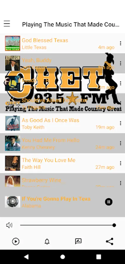 93.5 Chet FM. Playing the music that made country great. Chet is just a good old country boy who wanted to bring the South to the Golden Heart City. He brings his massive record collection to the airwaves every day. Without all those silly DJs yacking, laughing and taking up valuable song time. And the shortest breaks around, you're never far from the next tune. Chet takes you through the ages with all the tunes that made country great, and a few of the newer ones that are keeping country great.