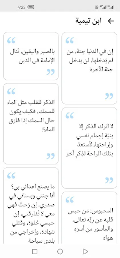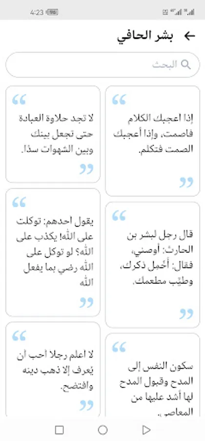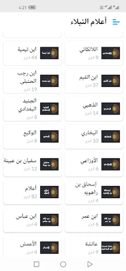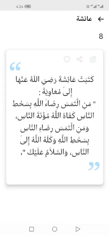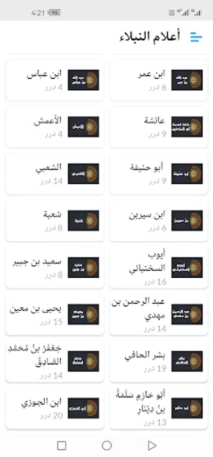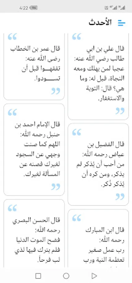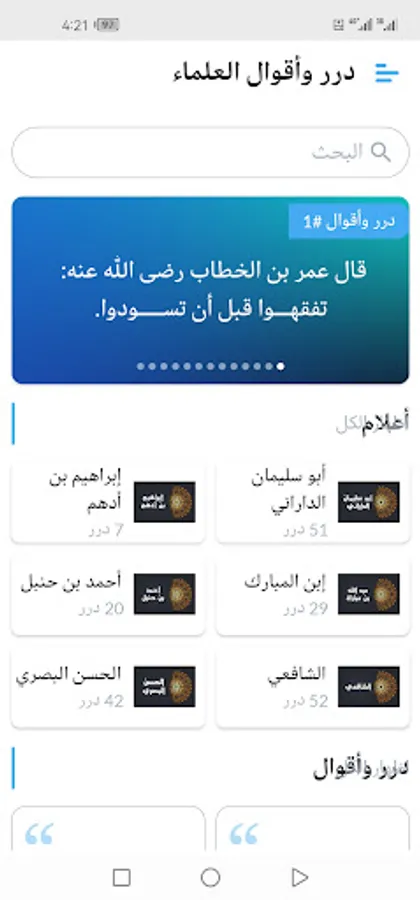 The application displays more than a thousand pearls and sayings about the great imams of the predecessors (Abu Bakr Al-Siddiq, Othman bin Affan, Abu Suleiman Al-Darani, Ibn Taymiyyah, Ibrahim bin Adham, Ibn Al-Mubarak, Ahmed bin Hanbal, Al-Shafi’i, Al-Hasan Al-Basri, Ibn Al-Qayyim, Al-Fudayl bin Iyad, Sufyan Al-Thawri, Abdullah bin Masoud, Ali bin Abi Talib, Omar bin Al-Khattab, Omar bin Abdulaziz, Al-Dhahabi, Malik bin Dinar, Yahya bin Muadh, Junaid Al-Baghdadi, Al-Bukhari, Al-Waki’, Al-Awza’i, Sufyan bin Uyaynah, Ishaq bin Rahwayha, Ibn Umar, Ibn Abbas, Aisha, Al-Amash, Abu Hanifa, Al-Sha’bi, Ibn Sirin, Shu’bah, Ayoub Al-Sakhtiani, Saeed bin Jubayr, Abd Al-Rahman bin Mahdi, Yahya bin Mu’in, Bishr Al-Hafi, Jafar bin Muhammad Al-Sadiq, Abu Hazim bin Hazim Al-Jawzi and others).