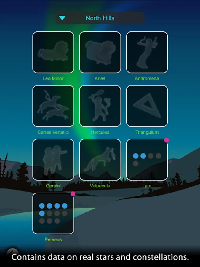 Each constellation consists of 3 to 16 stars, and when you find all the stars in that constellation, you can build the constellation. The building operation is a simple puzzle in which you drag the stars and fit them into the designated positions on the constellation chart.
