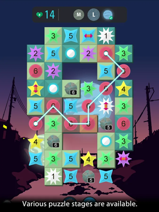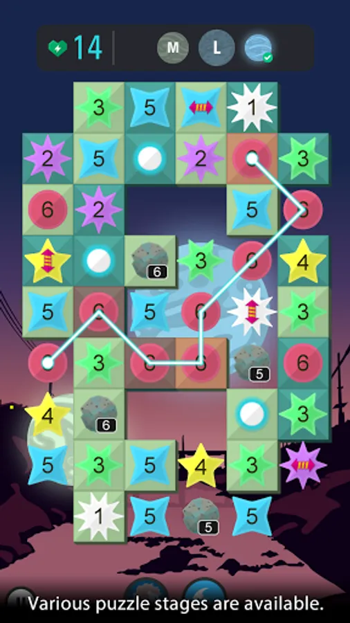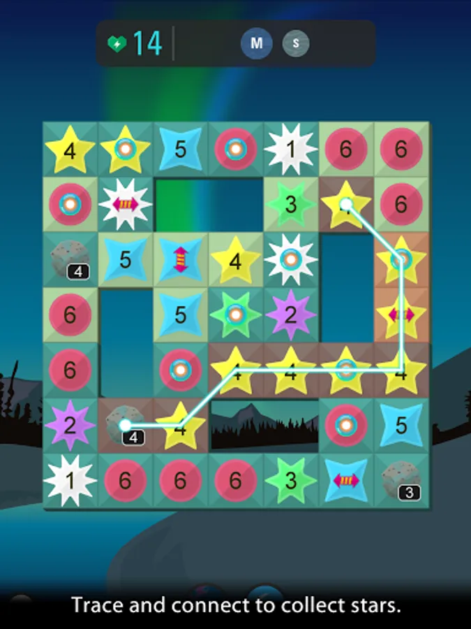 In the puzzle, there are six types of "stardust" ranging from first to sixth magnitude stars. If you trace three or more stardusts of the same type, they will disappear and a higher stardust will appear in their place.