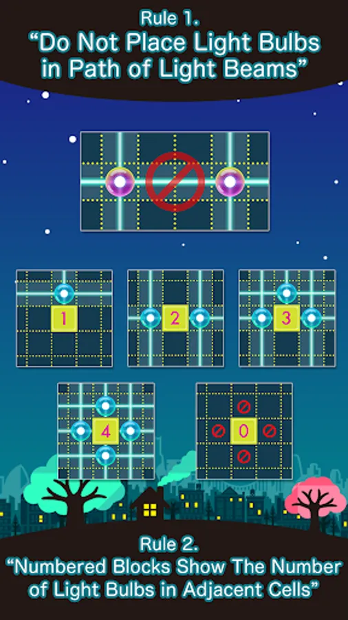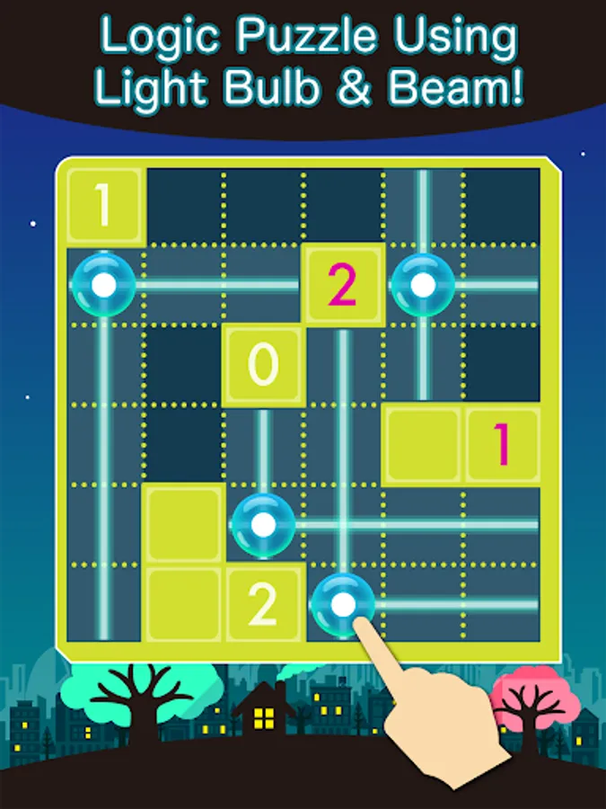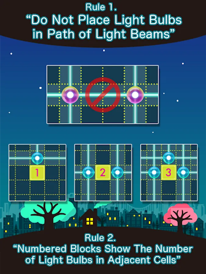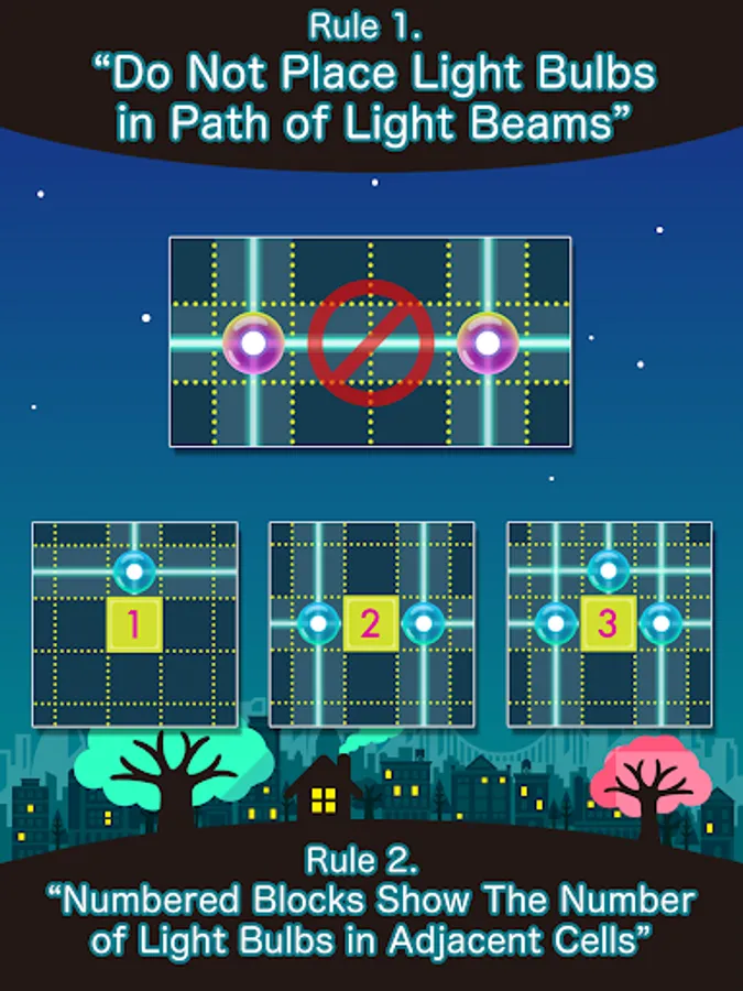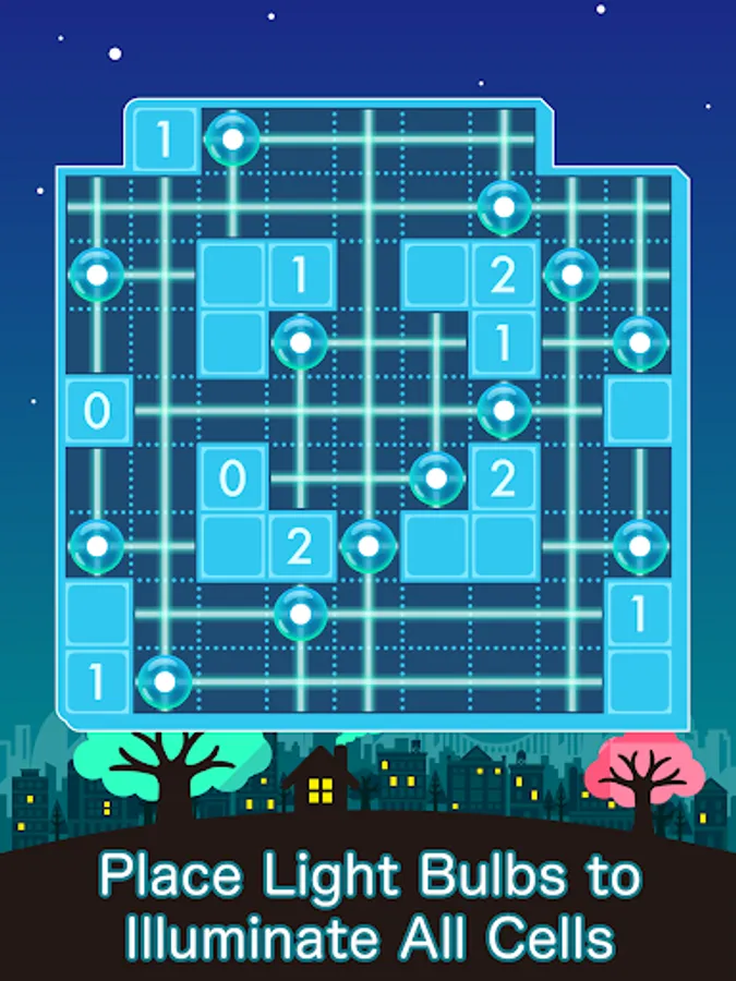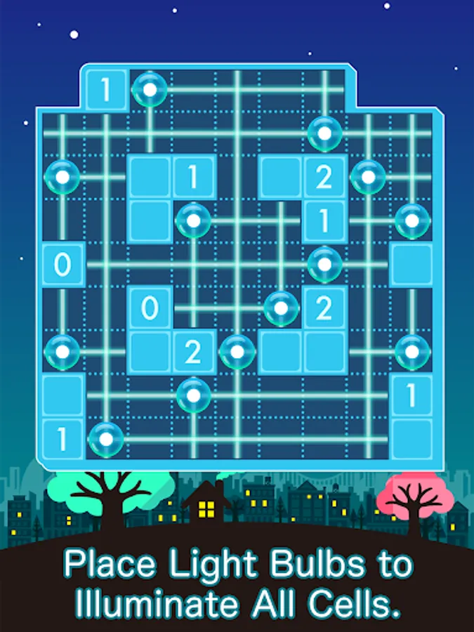 Tap any cell on the screen to place a light bulb in it. Light beams from the light bulb spread out in four directions and illuminate all cells in each direction.