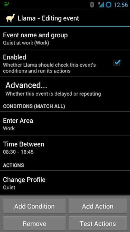 NOTE: Since GPS is not used, the location tracking is limited to the number of phone masts in your area. This will work best if you live in a populated area. If your home and work are covered by the same phone masts, you can try using the experimental Wifi-based location tracking. If that still doesn't work, you can remove the enter/exit conditions to make time-based profiles.