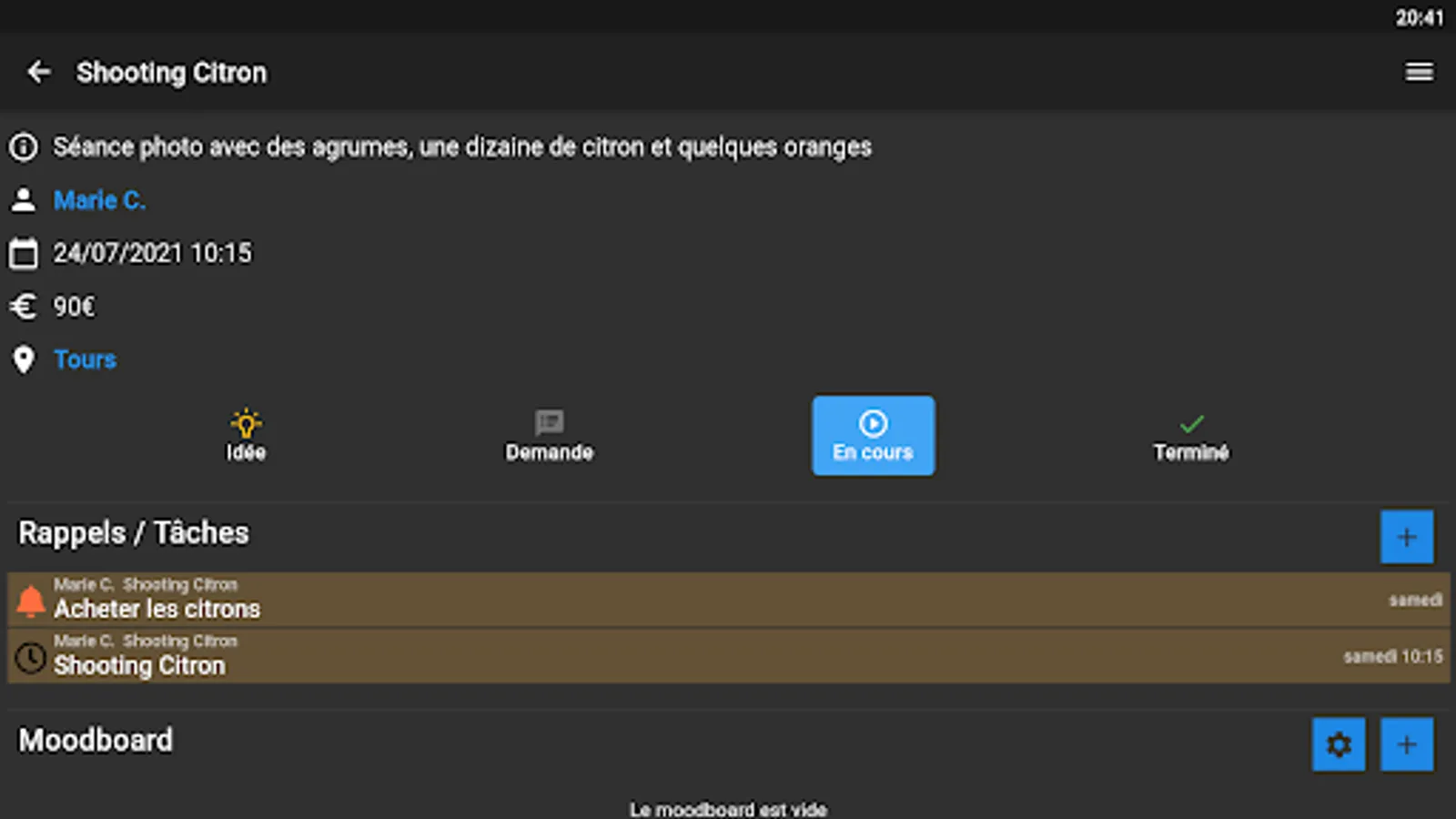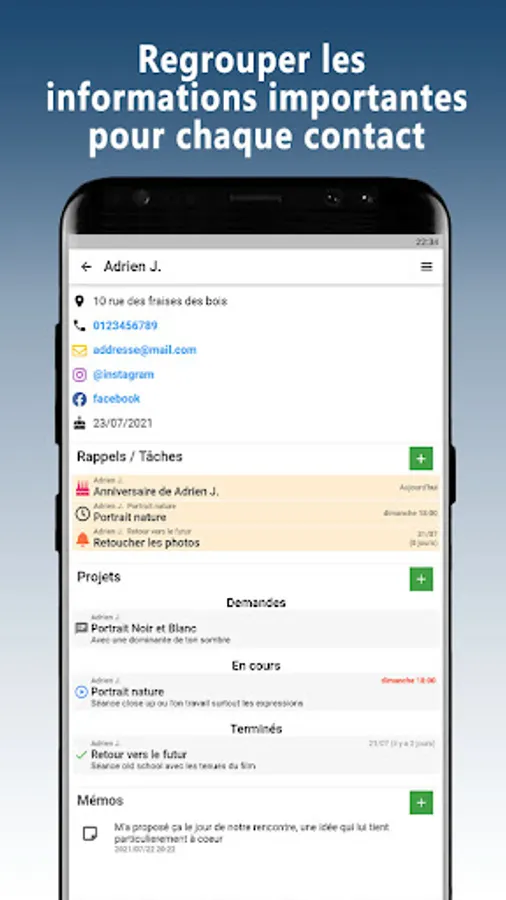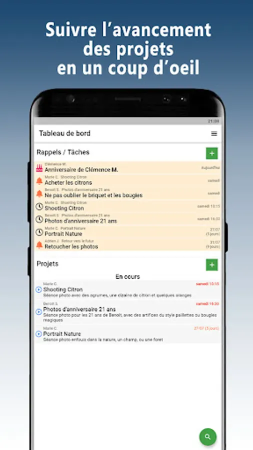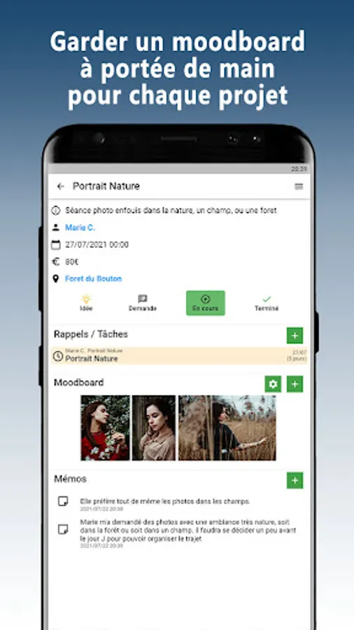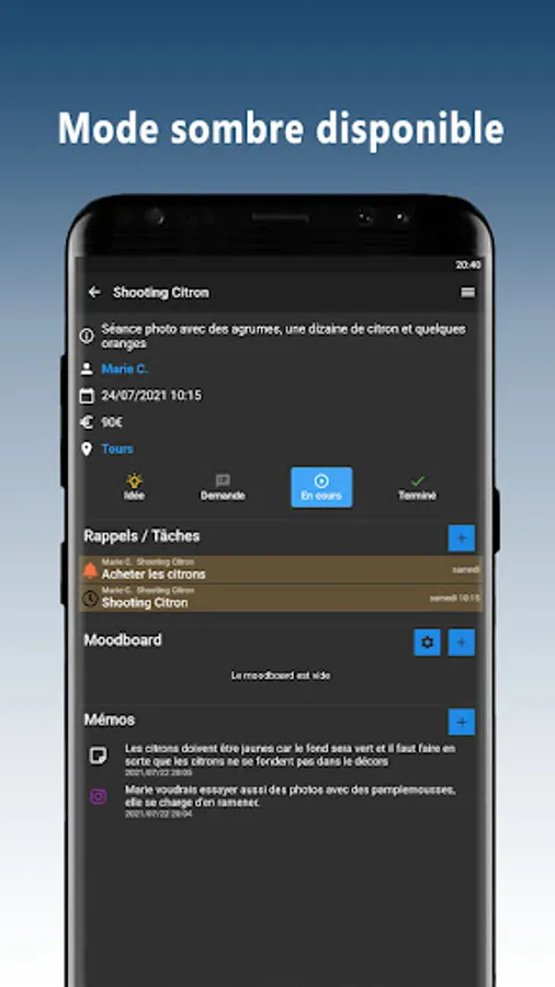 Project Memo allows you to follow your upcoming projects, write down information, your ideas or the requests you receive, the places and events associated with your various projects.