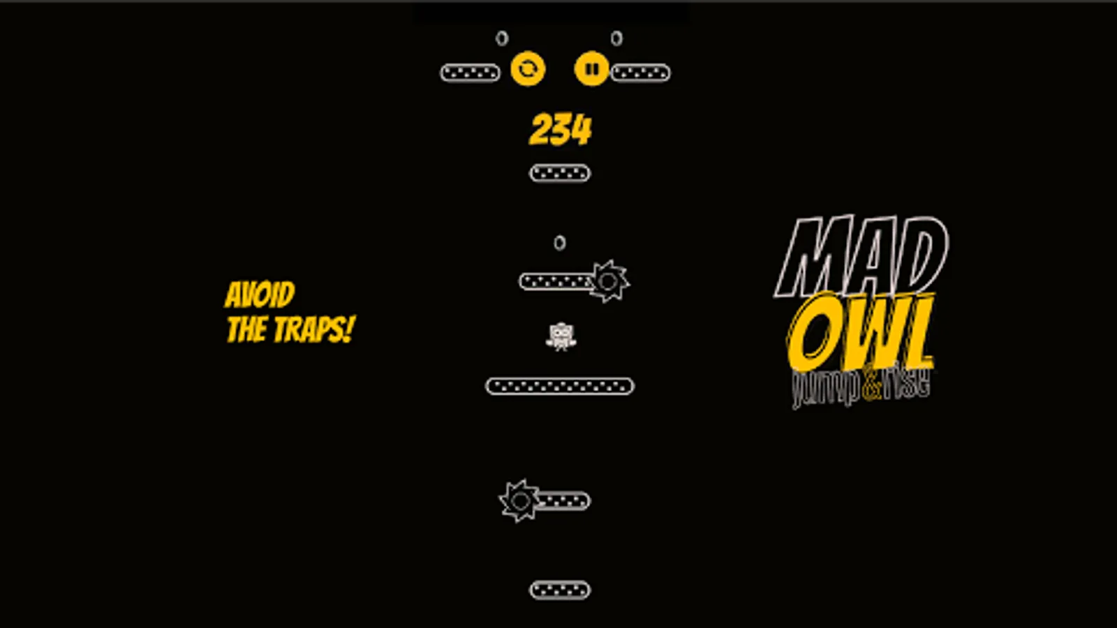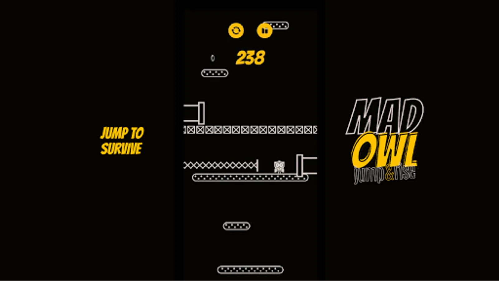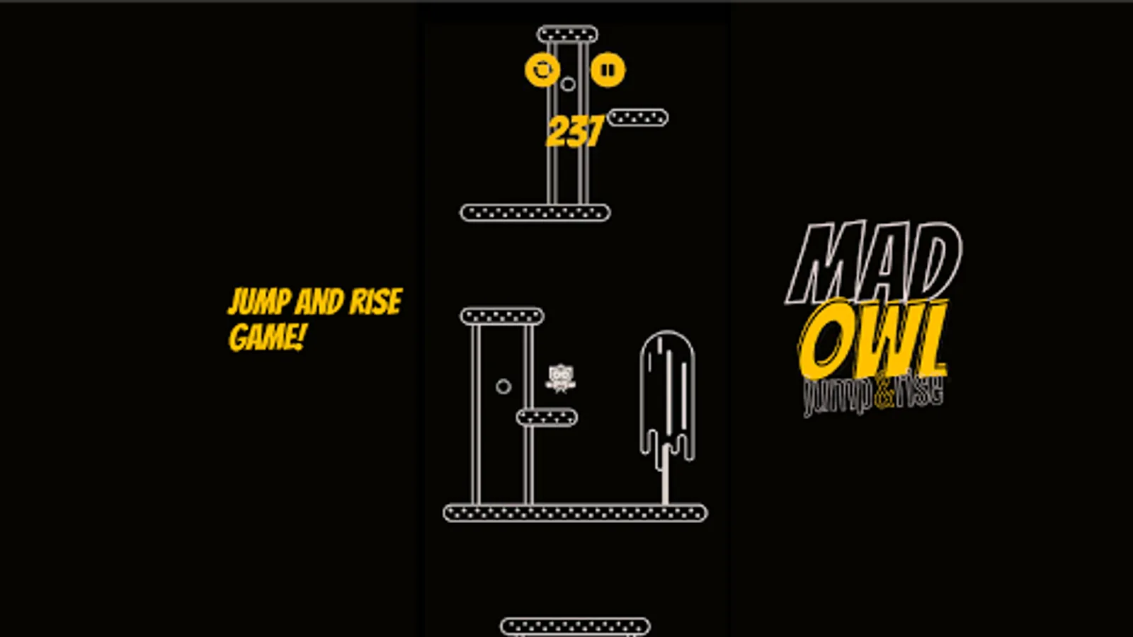 Mad Owl Jump Up and Rise is a survival game that also a hypercasual game, an arcade game, a jumping game, an adventure game. Mad Owl Jump Up and Rise is an intense game where the only thing you need to do is to get your owl as high as possible.
