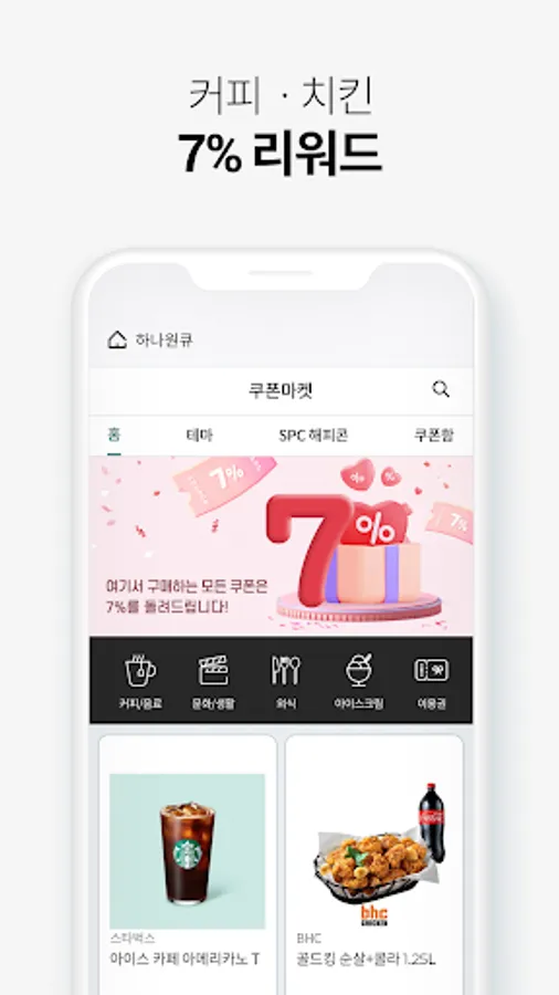 Hana 1Q Coupon Market = 7% Reward. Please remember this formula~ There are various coupons such as coffee, chicken, and movie tickets.