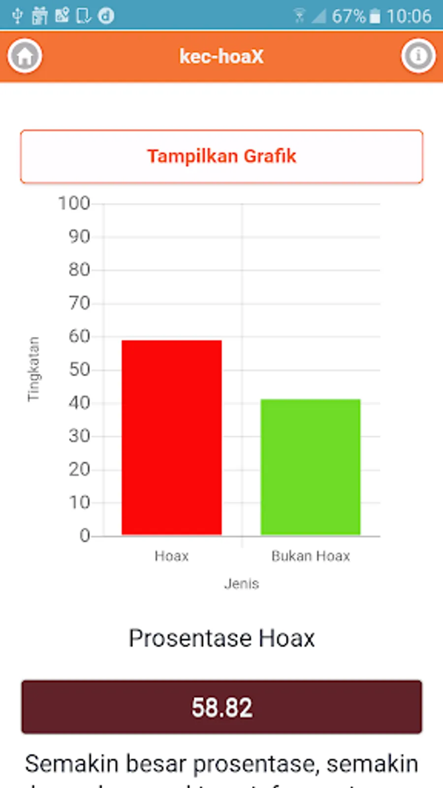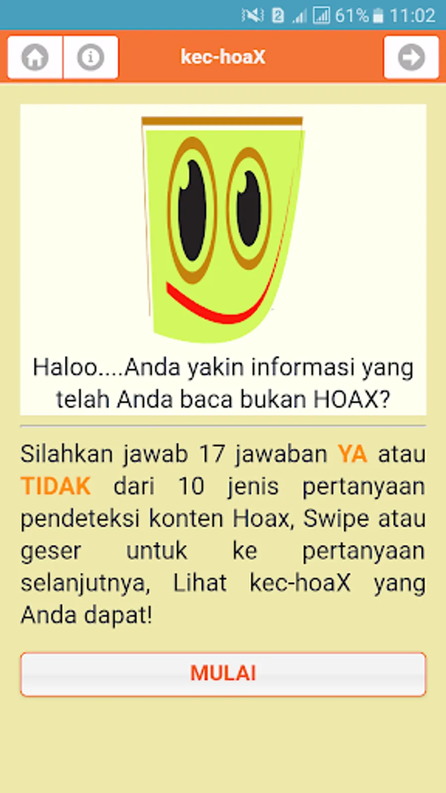 App contains questions that are sourced from www.thenewliteracyproject.org. Users can analyze the news obtained by answering 10 questions with 17 yes or no. If users obtain the percentage of large hoax, it can be obtained disumpulkan that news HOAX