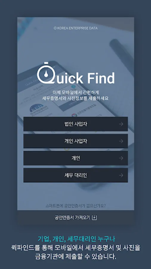 Quick Find is a mobile version of Find System (www.findsystem.co.kr), and when you log in, you must log in with the certificate registered with the National Tax Service Hometax.