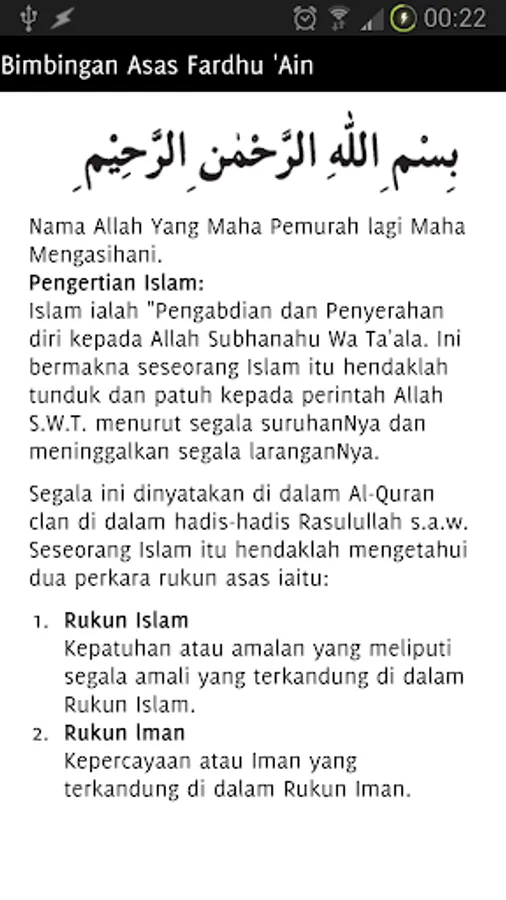 Table of contents: Rukun Islam, Rukun Iman, Najis, Wudu', Rukun Mandi, Solat, Zakat, Puasa, Umrah dll