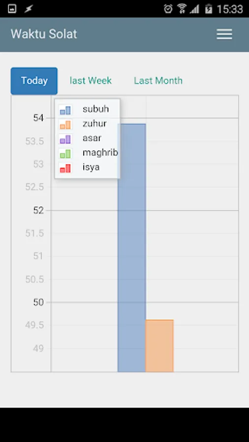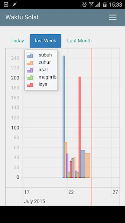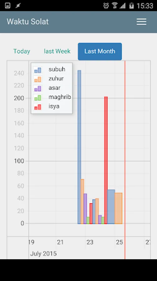 y axis is minutes since prayer time (subuh, zuhur, asar, maghrib and isya)