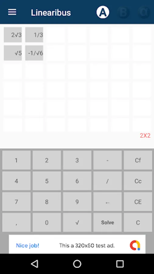 Linearibus has a work area of 12 matrices identified with letters from A to L. Keep in mind that matrices A and B will be free to use, while matrices C to L will be paid. You can also make free use of matrices whose dimensions are less than 7. Greater dimensions will also be paid.