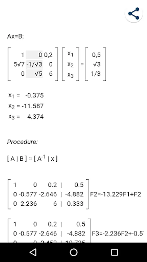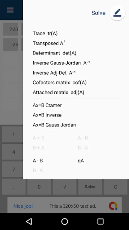 Through this application you can perform operations with matrices, solve systems of linear equations, Ax = B, using the methods of Cramer, inverse by Adj-Det, Gauss and Gauss-Jordan.