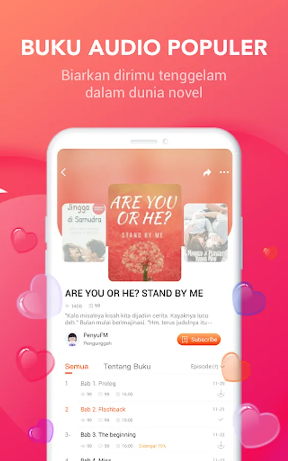 Here, you can listen to Audiobooks, Music, Podcast, Radio FM, Audio Live Chats and others, with contents that are not limited to romance, humor, horror, mystery, current news, talk shows, etc. Our audiobooks covers many popular topics, including romantic, horror, fantacy, fiction, ect.