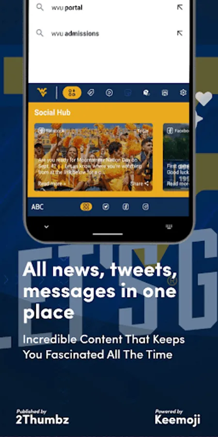 West Virginia University Official Custom Keyboard app provides you with the latest WVU Sports news and social media posts in one easy to connect social hub. Stay in touch with WVU athletics news at all times, right from your keyboard!