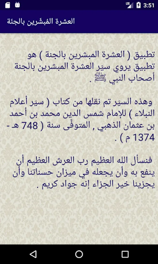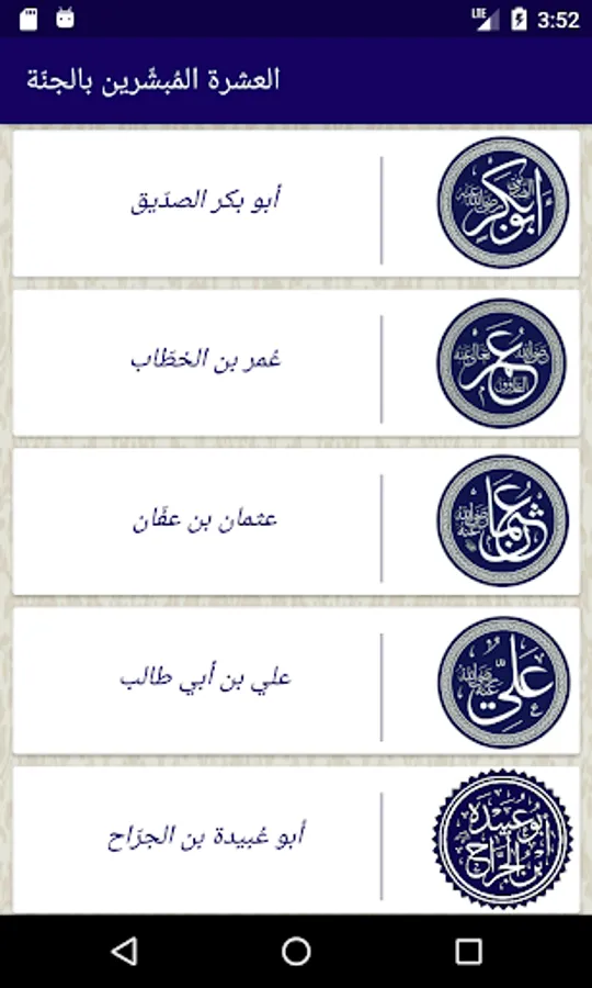 An application that contains the course of the ten missionaries heaven mentioned in the hadeeth of the Prophet peace be upon him narrated that 'Abd al-Rahman bin Auf said the Messenger of Allah, peace be upon him ((Abu Bakr in Paradise and Omar in Paradise and Uthman in Paradise and Ali in Paradise and Talha in Paradise, Zubair in Paradise and Abdul Rahman bin Auf in Paradise and Saad in Paradise and Saeed in Paradise and Abu Ubaidah ibn Al-Jarrah in Paradise). Narrated by al-Tirmidhi, 3680