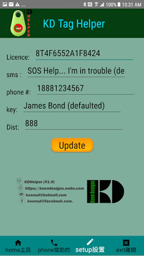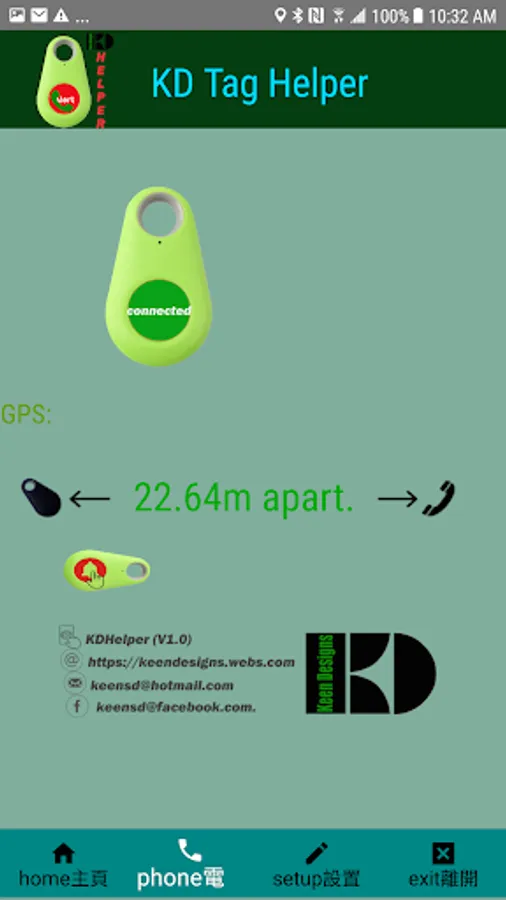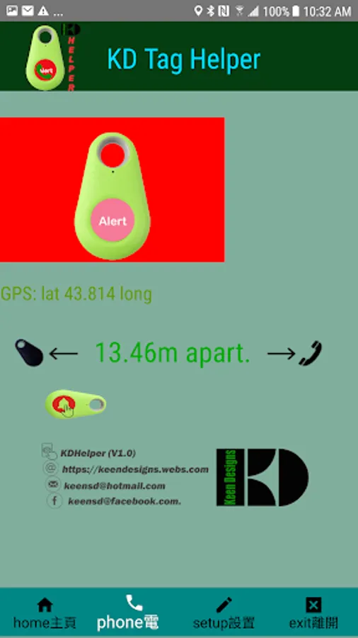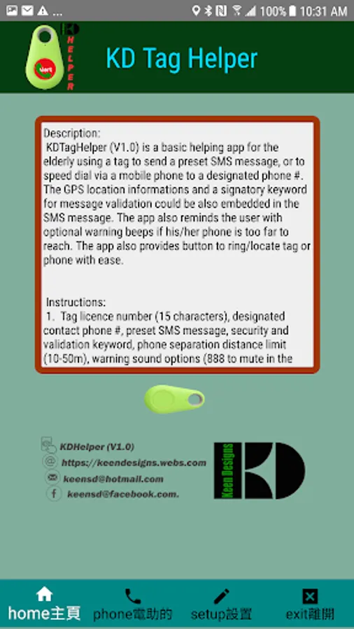 KDTagHelper (V1.4) is a basic helping app for elderly using a tag to send a preset SMS message, or to speed dial via a mobile phone to a designated phone #. GPS location information is embedded in the SMS message. The app also alarms the user if one’s phone is too far to reach, and provides buttons to ring/locate tag or phone with ease.