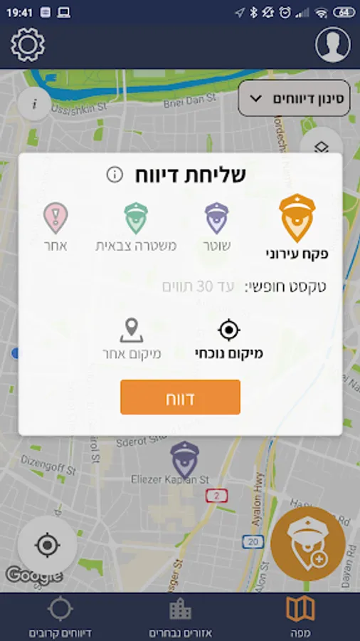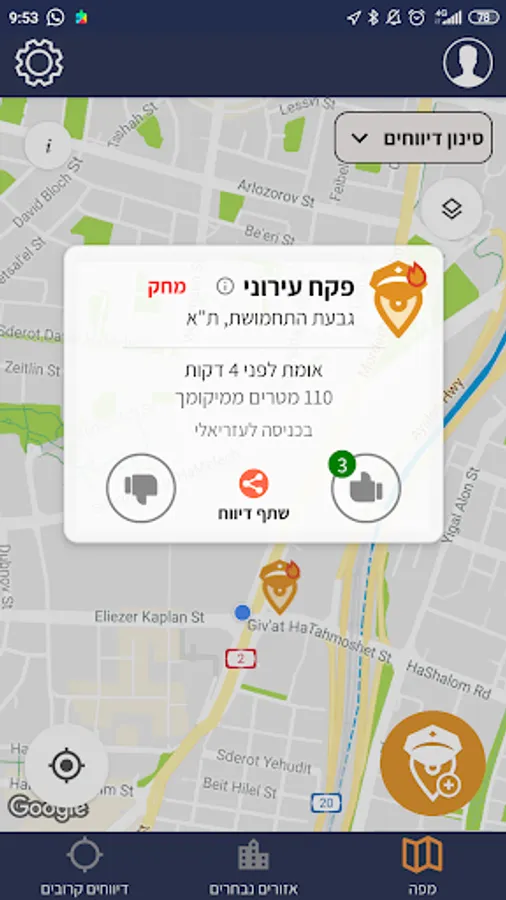 • לצפות במיקום דיווחים מכל הארץ, ששותפו בשעות האחרונות, על גבי מפה.