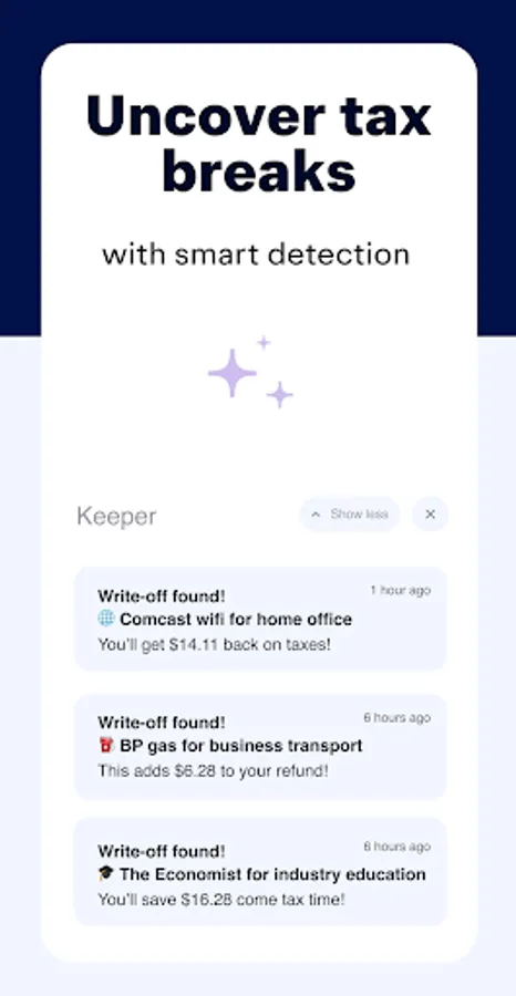 Keeper is especially valuable for small business owner, self-employed digital freelancers, and 1099 independent contractors because it automatically uncovers tax deductible business expenses among past transactions. No need to keep track of receipts or track mileage.