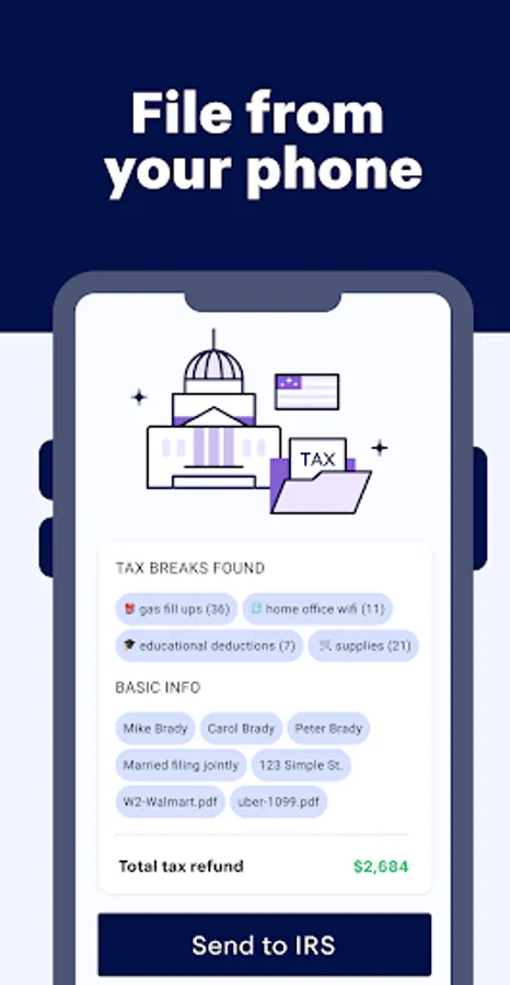 Connect a financial account to automatically uncover your tax breaks! On average, Keeper users increase their tax refunds by $1,249 per year vs using traditional tax filing software. At tax time, file with IRS and State directly through the app.
