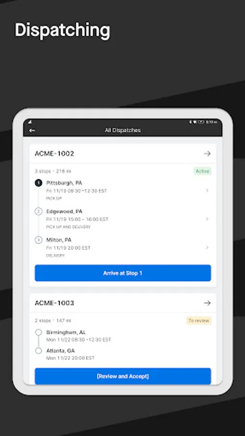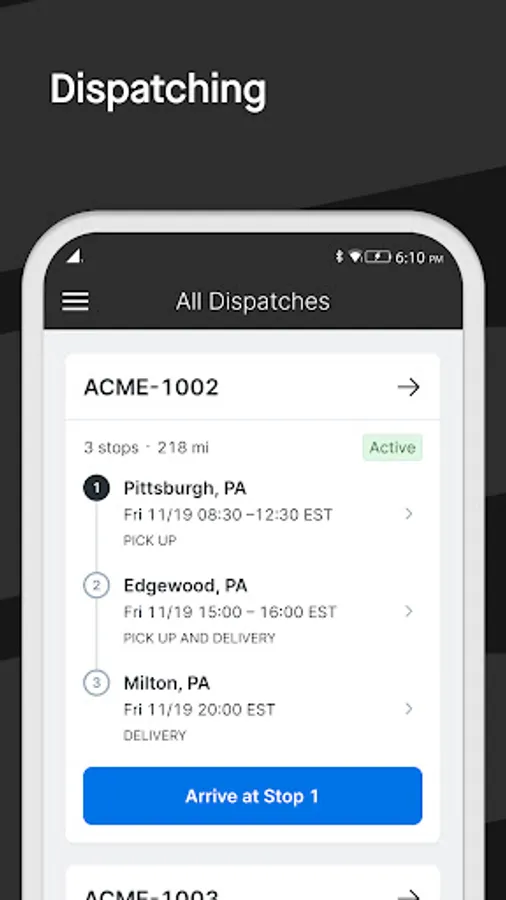 When dispatched, GPS location data is shared to the Motive Fleet Dashboard to update dispatchers and fleet managers on stops and arrivals.