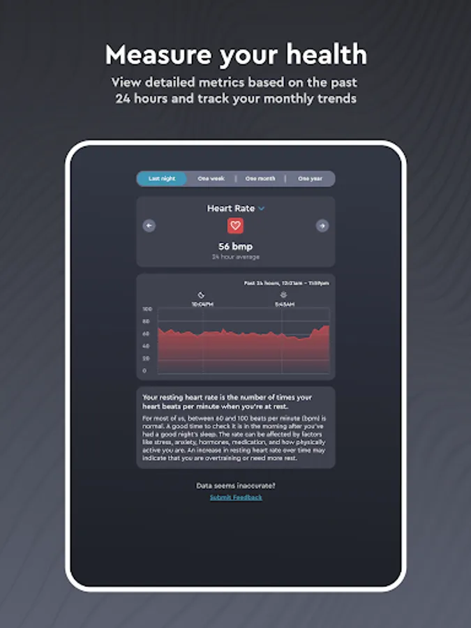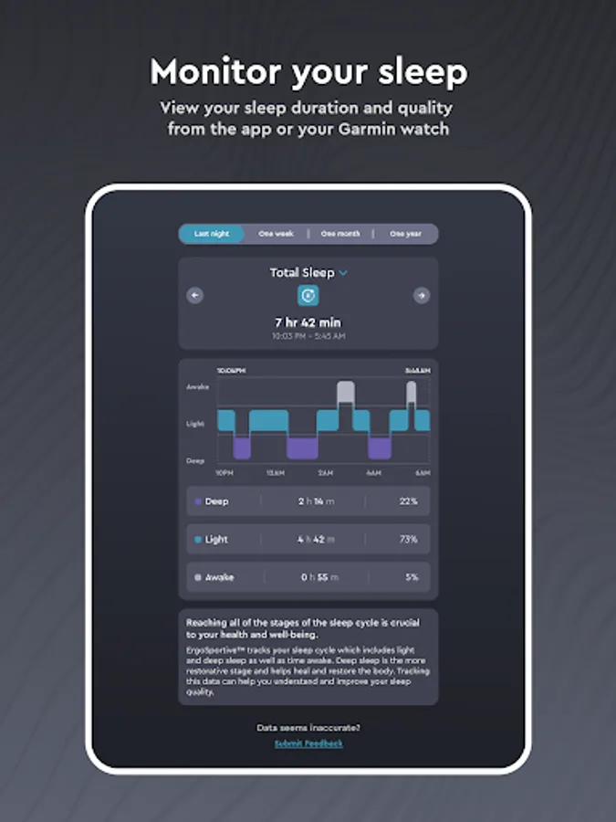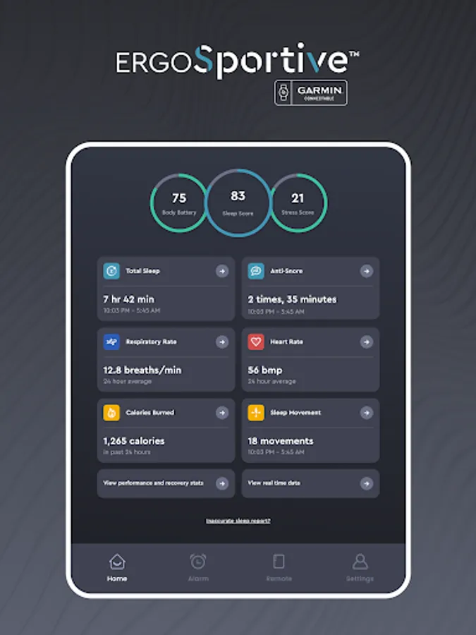 ErgoSportive shows your 24-hour report, including heart rate, breathing rate, calories burned, body battery, fatigue index, etc.